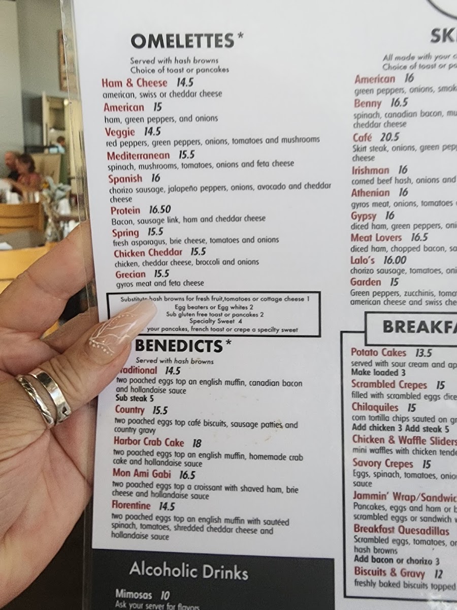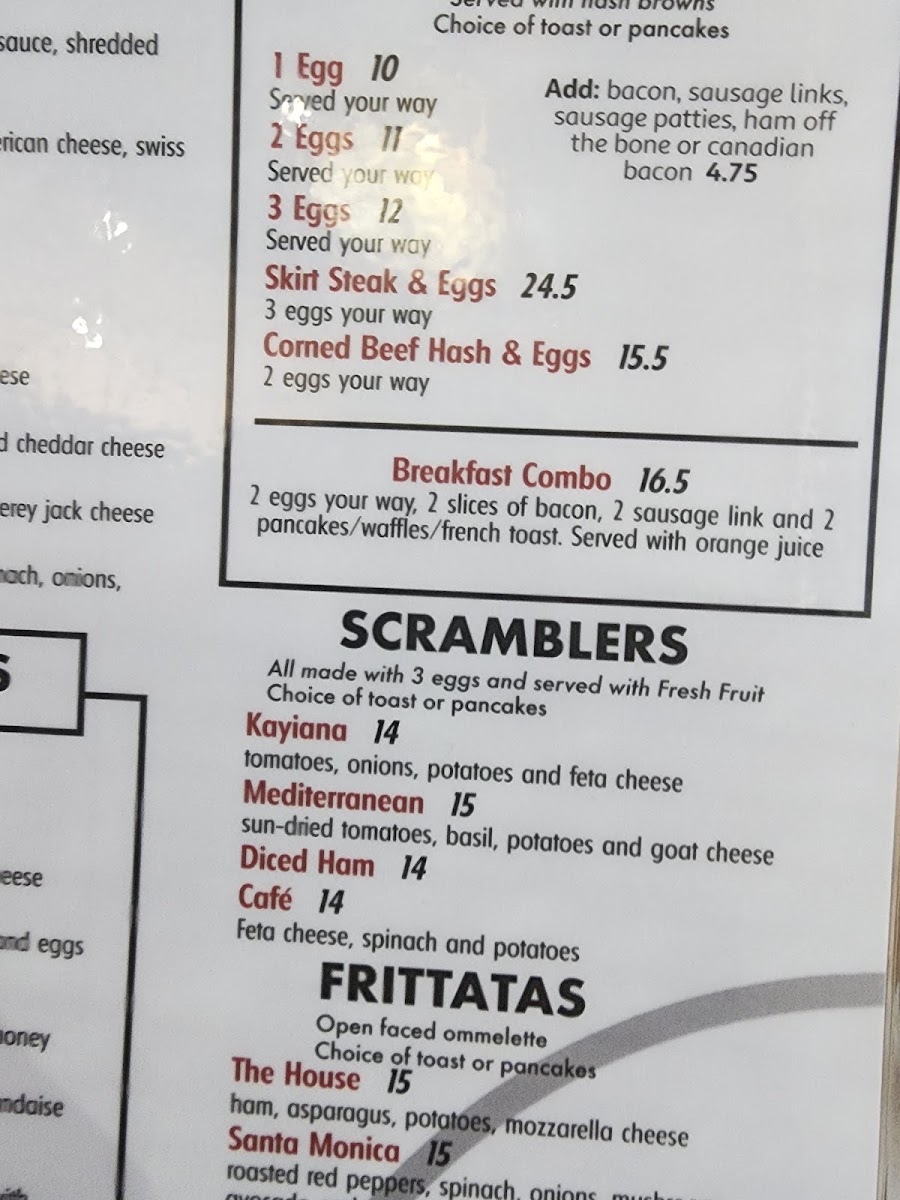 Comes with a side of your choice. Add bacon, sausage, links or patties, ham off the bone or Canadian bacon for an additional charge.